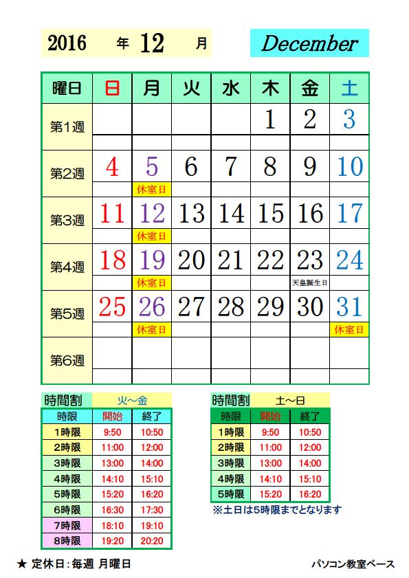 12月分の日程カレンダーができましたので