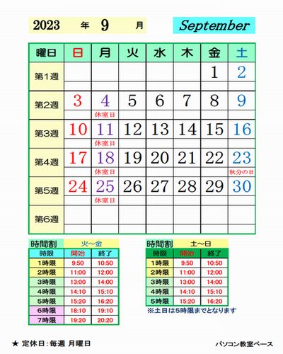 2023年9月のお休みは定休日の月曜日となっております。