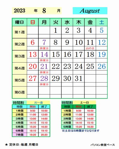 少し早いですが、8月分の日程カレンダーを作成しましたので