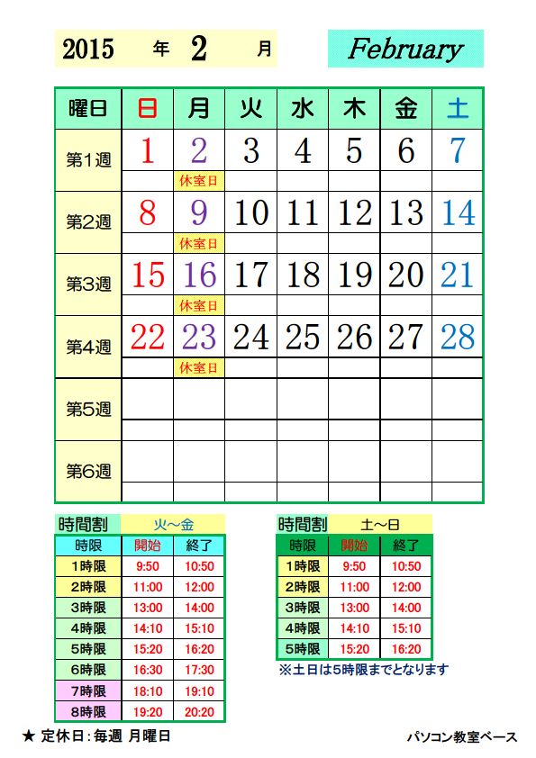 2月分の日程カレンダーができましたので