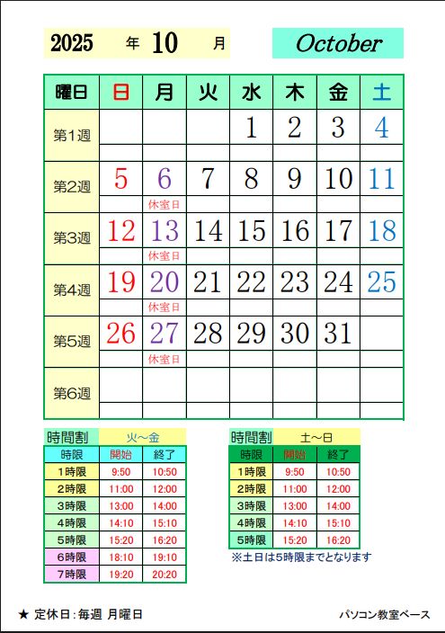 営業カレンダーの2025年(令和7年)10月および11月分を