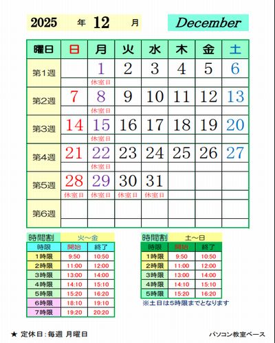 年末月の12月は、月曜日の定休日および12/28(日曜日)から